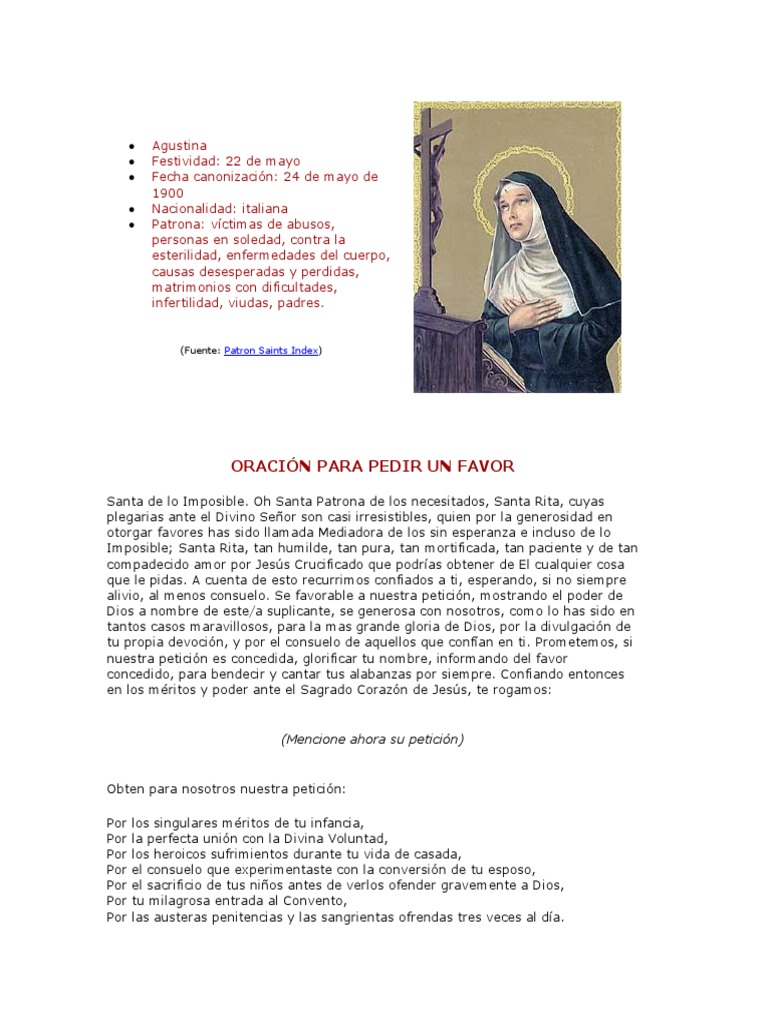 Source: santaritadacascia.org Oh santa patrona de los necesitados, santa rita, cuyas plegarias ante el divino señor son casi irresistibles, quien por la generosidad en otorgar favores has sido llamada mediadora de los sin esperanza e incluso de lo imposible;